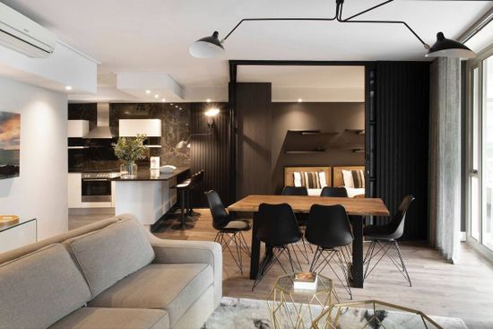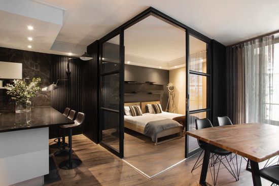 - The kitchen is modern and compact, yet fully functional with high-end appliances.