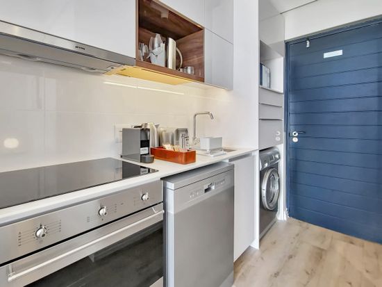 Studio, open plan apartment in the heart of the City, located in a high end apartment building. This studio has high quality finishes and high end appliances, to insure you have everything you may need for your stay. There is a comfortable bed, seating area and smart TV to enjoy your favourite shows