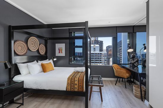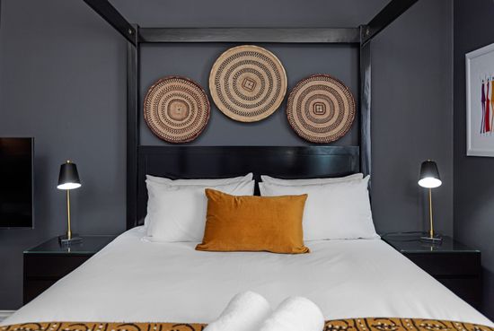 This designer, African-inspired studio apartment features an elegant design with authentic African finishes throughout. The property includes a fully-equipped kitchen, a statement queen-size four-poster bed, a smart TV, a functional workspace, air conditioning, and a bathroom with a walk-in shower. The 25th floor is the perfect place to enjoy the Cape Town night skyline and daytime city views. Catch a glimpse of Table Mountain while lying in bed, or see the harbour at a distance…