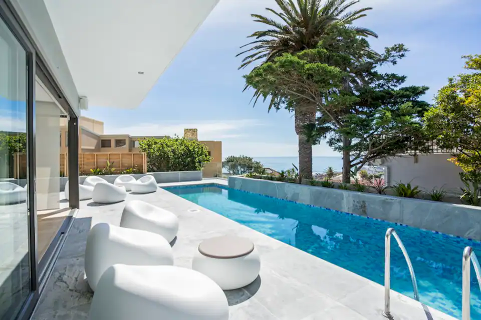 Amara Villa is an impressive open plan home away from home consisting of three levels with seven large en-suite bedrooms, a tropical private garden with a 12×3 pool and a 3x3m top-level pool with sit out area overlooking the ocean. This fully fitted Italian-style designer kitchen is open plan with a dining room and lounge. The dining area opens onto the pool and intertwining area with magnificent views of the Twelve Apostles mountains and lions head. There are two vast balconies for entertaining or lounging after a day on the beach or sightseeing. A fantastic rooftop pool area for watching the sunset. The villa comes with a wine bar that is stocked with the owner's personal wines. A houseman doubles up as a driver. This villa is just moments away from Camps bay beach.