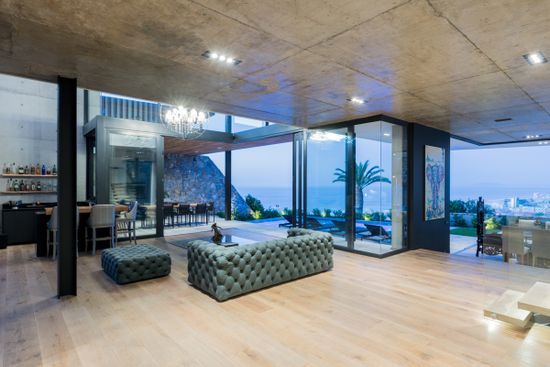 This four bedroom en-suite villa is set over 3 floors with an additional self-catering flatlet. The design combines industrial elements such as raw steel, timber floors, and concrete complimented by colourful curated art pieces and custom designed furniture. The centrepiece of the home and pièce de résistance is on the second level which hosts the entertainment area where you will find , the pool, garden, braai area, and a centralized custom built double volume courtyard with a tree for added privacy. This whole level has been designed for seamless indoor and outdoor living creating a space of peace and tranquillity capturing the sweeping views across the Atlantic Ocean. The four bedrooms are located on the top floor offering either sea or courtyard views and a further level above hosts the spacious rooftop entertainment area complete with a sheltered bar and built in seating.
