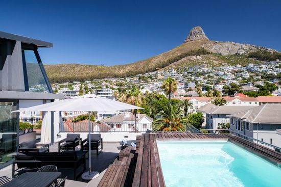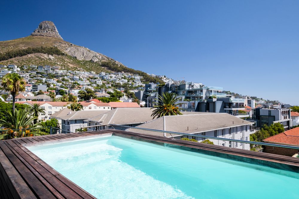 The middle level is the open-plan kitchen with integrated SMEG appliances. The living and dining areas have double volume floor-to-ceiling glass windows, showing the view of Lions Head. The glass sliding doors lead onto a private deck with a swimming pool and outdoor barbeque area. The views from the deck are exquisite - Lion's Head and right the way across the city. Sip on a chilled glass of South African wine, with toes dipped into the pool while watching the sun go down and the city lights beginning to twinkle.
