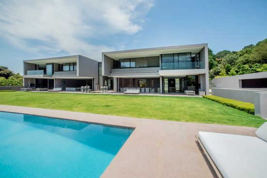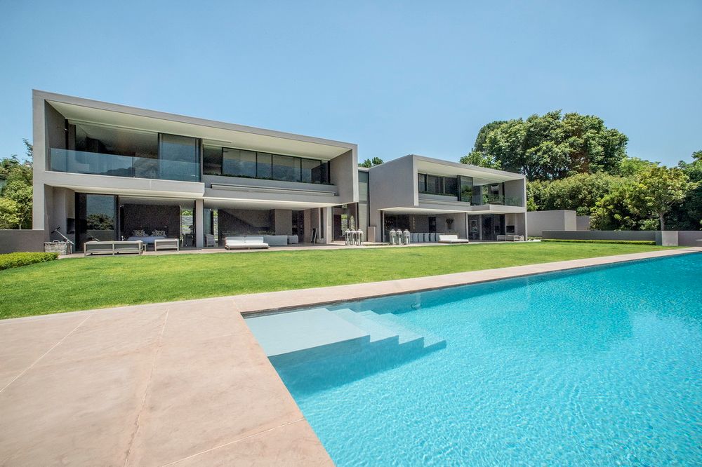 Bishopscourt Bliss is a monolithic masterpiece of architectural perfection, designed by an Interior Designer owner and built with the help of Chilean architect Luis Mira. The 2.5 acre property is set among lush greenery and features a variety of outdoor and indoor water features, as well as a spacious entrance hall, state-of-the-art kitchen, swimming pool, games room, wine cellar, cinema, study, bar, squash court, and spa. The Indian Dholpur sandstone that dominates the villa's design is inspired by the "haiku" effect of Japanese architect Tadao Ando's style, creating a space that is a reflection of nature in all its glory. The villa's bedrooms and bathrooms feature expansive views, and a minimalist design that is enhanced by signature pieces of art by renowned world artists. The location of the Bishopscourt Bliss is at Bishopscourt, a 15-minute drive from Cape Town’s city centre. and 10-minute drive to Constantia wine region.