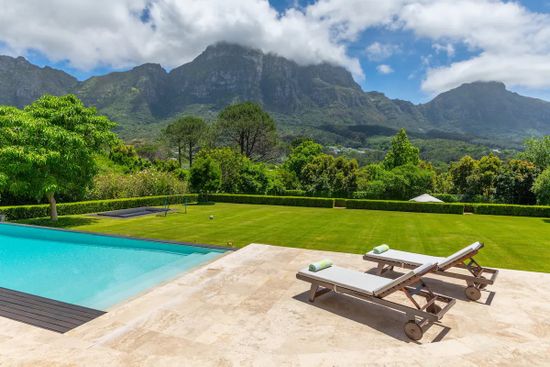 Quite possibly the finest mansion in Cape Town. This luxurious 9-bedroom villa is hidden in a tranquil and private setting in Bishopscourt, with the best view of Table Mountain possible. State-of-the art everything, no expenses spared, this is for the refined family that appreciates the finer things in life. Highly-trained team of staff, manicured lawns, floodlit tennis court, heated pool, jacuzzi - the highest quality of everything. High-tech safety features. You simply won't find better.