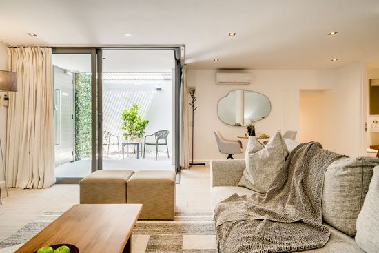 Blue Ocean Suite is a contemporary holiday apartment in Camps Bay. It has a main bedroom with a king bed, air con, desk, and ensuite. The kitchen includes an electric hob and Nespresso. The living area offers seating for two, TV, sound bar, and dining for two. A peaceful courtyard and alarm system complete this comfortable stay.