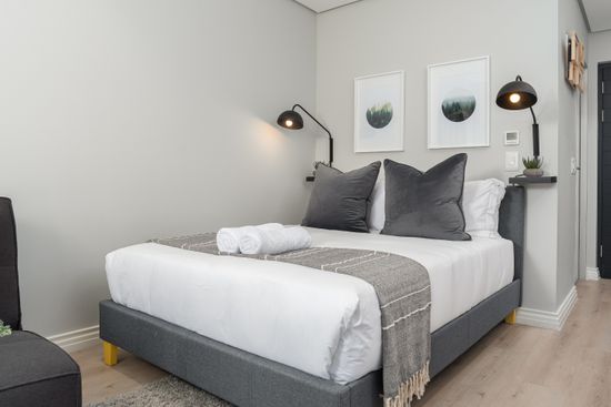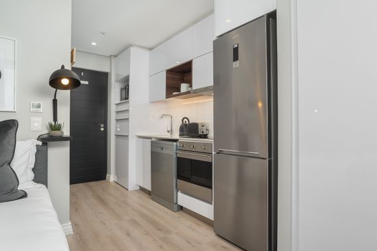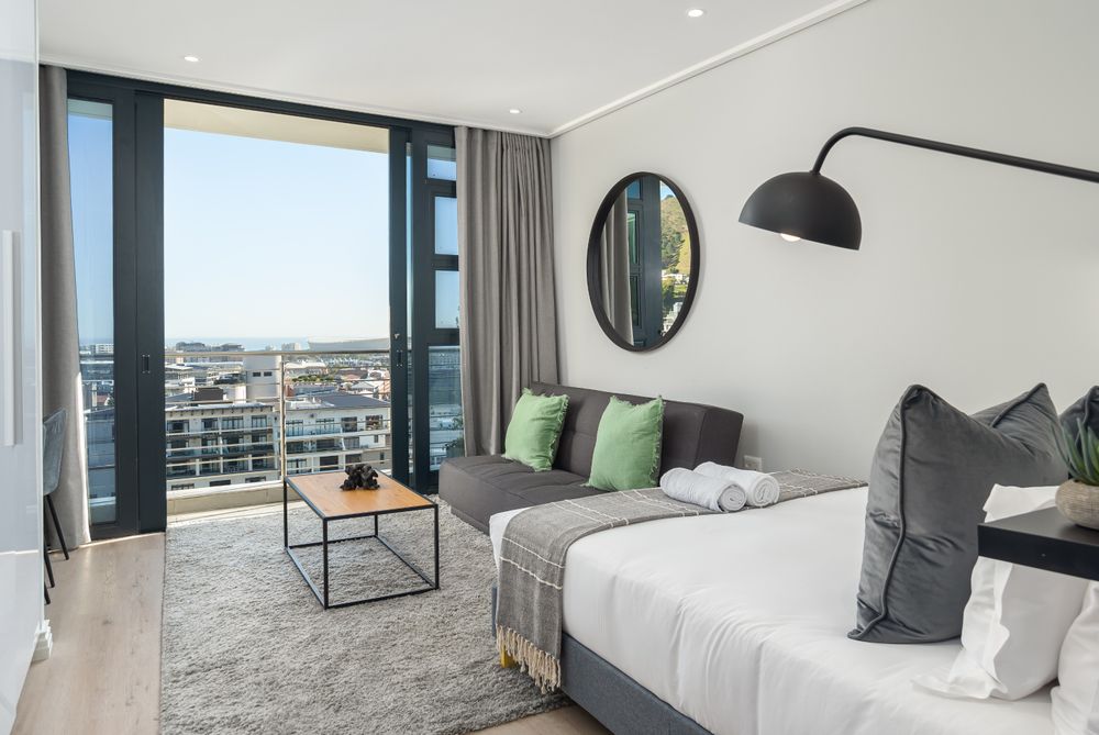 This modern studio apartment features cleaver compact design with all the essentials. A fully equipped kitchen, comfortable double bed, TV with Netflix, bathroom with walk-in shower and a balcony with 19th floor views of the ocean, Lion's Head and Signal Hill.