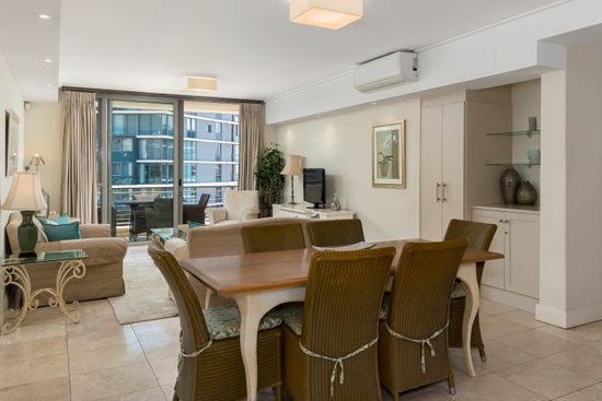 This spacious two-bedroom apartment overlooks a canal on the city centre's harbourfront. Conveniently located for either leisure or business travel, Canal Quays is just a 5 minute walk from the CTICC, and a 10-15 minute walk from the V&A Waterfront. Table mountain and the famous beaches of Clifton and Camps Bay are a scenic 10-15 minute drive away.
