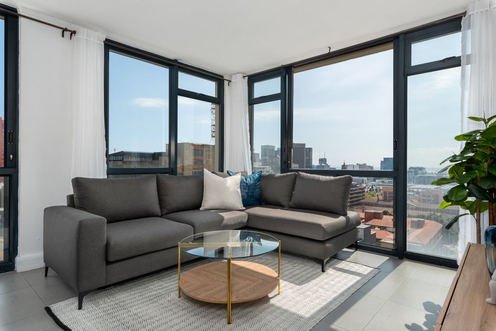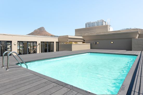 The building features a rooftop deck and pool with panoramic views of Cape Town. The apartment has an open-plan kitchen, lounge and dining area with floor-to-ceiling windows displaying a beautiful view of Cape Town.