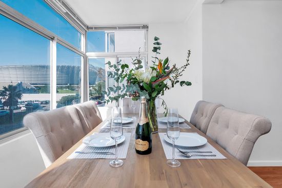 Stylish Mouille Point apartment with sea and stadium views, two bedrooms, open-plan living and secure access, located near Cape Town Stadium and the Sea Point Promenade.