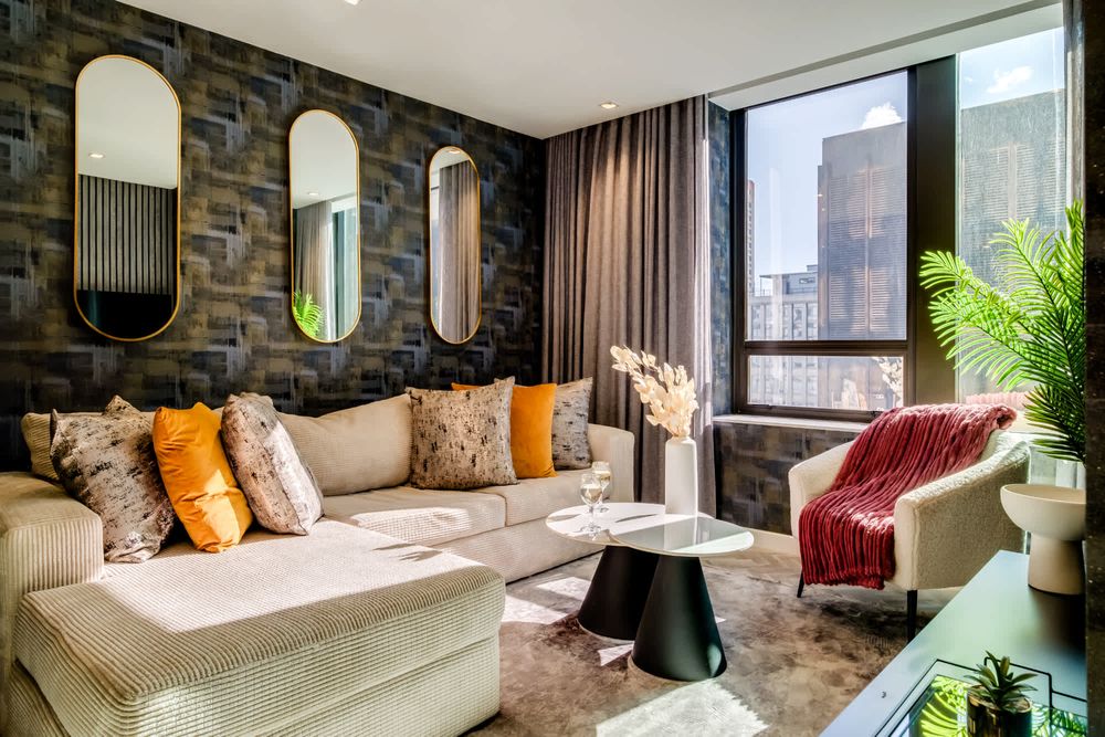 City Suite 904 combines traditional design with modern convenience in Cape Town City Centre. The main bedroom features a king-sized bed, centralized air conditioning, and city views. The dedicated bathroom includes a shower and a single vanity. The living area, designed for relaxation, offers seating for four, a TV, and city views.