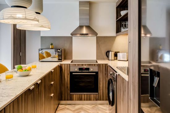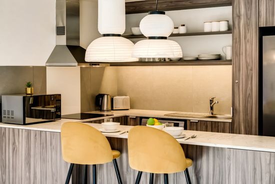- The kitchen is well-equipped with an electric hob, a washer, and a breakfast bar for two, catering to both everyday meals and more relaxed dining experiences.