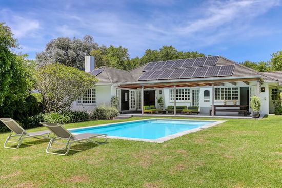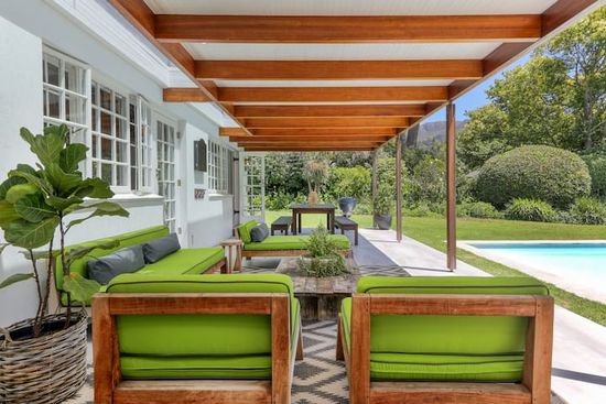 Private Electricity Back-Up. This beautiful 4 bedroom family home in Upper Constantia will ensure you have a relaxing holiday. The large swimming pool is set in a peaceful and well established garden with an outdoor patio for lounging and dining. Two of the bedrooms are en-suite and the other 2 share a family bathroom. There is an open-plan kitchen, dining and lounge area and also a separate TV room for children. The house is serviced Monday to Friday.