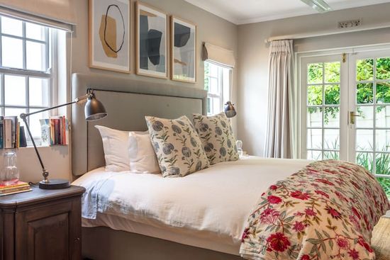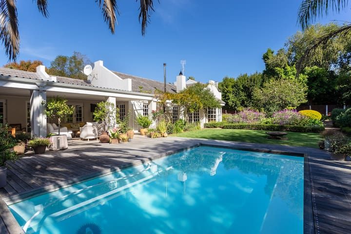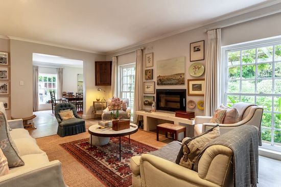 Classic Constantia beauty. Perfect address, ticks every box. Filled with beautiful art and artefacts – relaxed, stylish comfort with lots of extras. Fully equipped open-plan kitchen (a cook’s dream) onto lounge with Morso fireplace. Plenty of inter-leading spaces with lots of extras. Country garden with pool and north-facing terrace – sheltered all year round. Fantastic staff. This is a real gem.