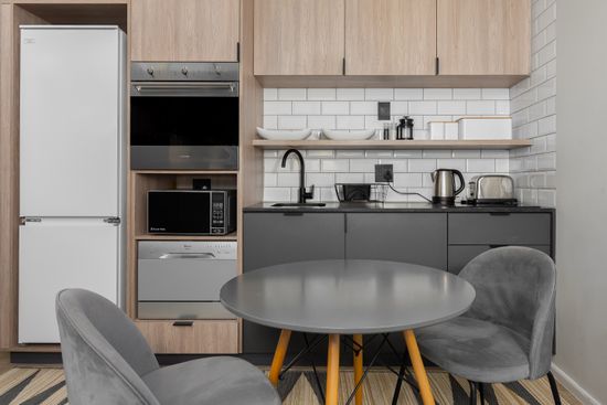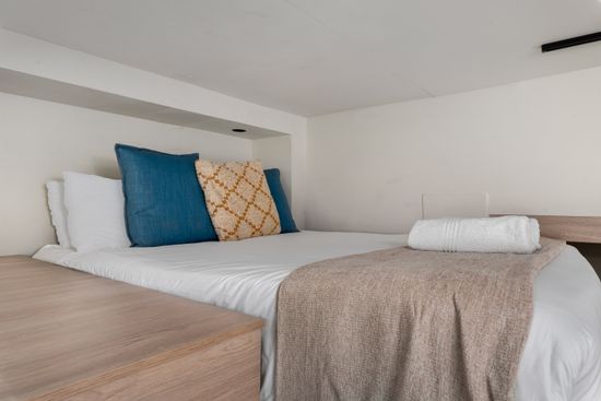 This compact apartment features clever spacial design and modern finishes throughout. The kitchen is fully equipped with top-of-the-range SMEG appliances and the open-plan lounge/dining area has everything needed for a comfortable stay. The bedroom area has a cozy queen size bed and a TV with Netflix.