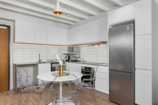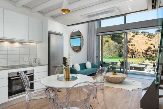 This apartment offers stunning, contemporary design. It features a modern open-plan kitchen, dining area and lounge which opens onto a balcony. The kitchen is fitted with high-end appliances, and the living area has everything you need to make your stay as comfortable as possible. The bedroom is located in the upstairs loft. It has a comfortable queen size bed and an en suite bathroom.
