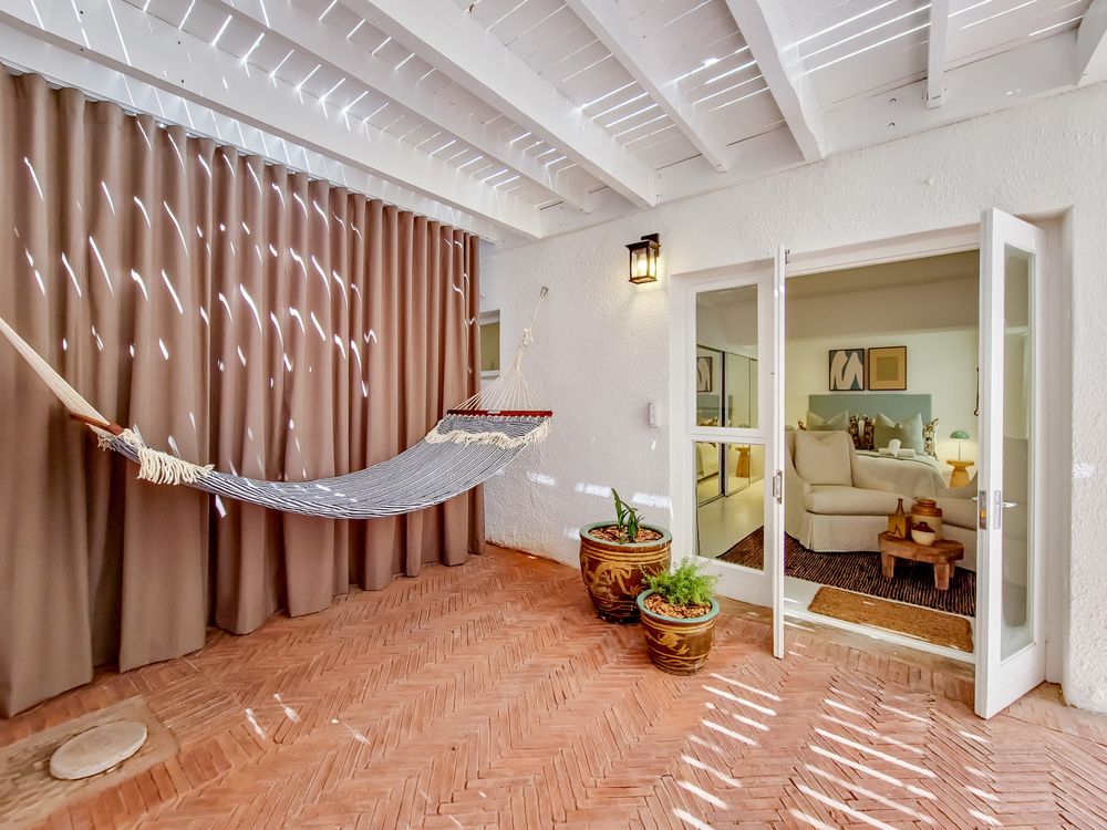 The studio is furnished with a comfortable queen-size bed and offers a modern en-suite bathroom fitted with a spacious shower, a toilet, and a handbasin. The kitchenette is well-equipped for self-catering and includes a microwave, a bar fridge, a gas stove, an oven, as well as cutlery and crockery. The open-plan studio features 2 comfortable chairs that overlook the enclosed private patio, which includes additional seating and a lovely hammock for relaxation.