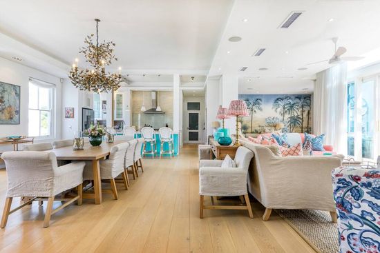 The living room features lovely large sofas, a wood fireplace for cosy evenings, and opens out onto the verandah. There is a second lounge area tucked around the corner, decorated in tropical wallpaper with a large L-shaped sofa and television for absolute relaxation.