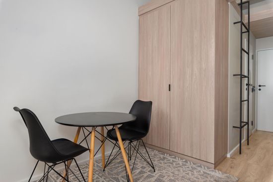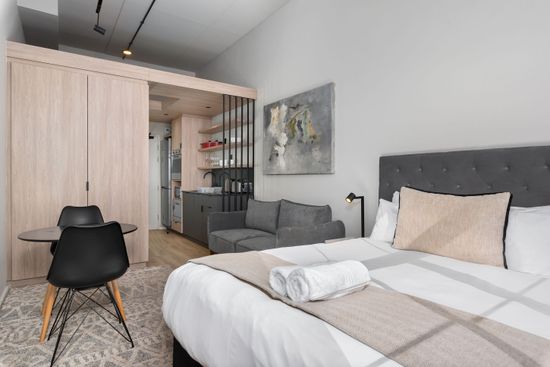 This compact apartment features clever spacial design and modern finishes throughout. The kitchen is fully equipped with top of the range SMEG appliances and the open-plan lounge/dining area has everything needed for a comfortable stay. The bedroom area has a cozy queen size bed and a TV with Netflix.