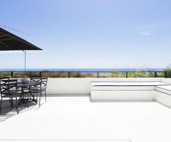 The one bedroom apartment is made up of open plan living on the lower level and a lovely master bedroom suite up the stairs. Get lost in the sea views from your King size bed, laze in the bath or enjoy the rain shower. If you have a third guest, suitably a child, the house manager will make a bed on the sofa every evening. There is also an available cot for infants. The apartment is serviced every morning, washing and ironing of clothing is also provided.