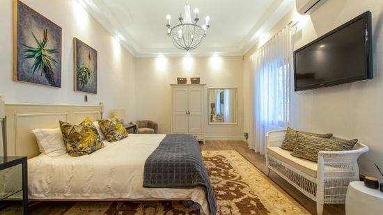 The farmhouse boasts three large lounges, a fully-equipped gym complete with a sauna, a pool table, two heated swimming pools, a fireplace, state-of-the-art kitchen, an outdoor dining and entertainment area, and a wine cellar. The property is equipped with a solar-powered backup battery and two inverters to ensure an uninterrupted power supply at all times, even during load shedding. This fully-serviced farmhouse boasts top-notch cleaning staff, as well as concierge services, to ensure a comfortable and hassle-free stay. Moreover, the property is a secure and safe haven for you and your loved ones to relax and unwind in