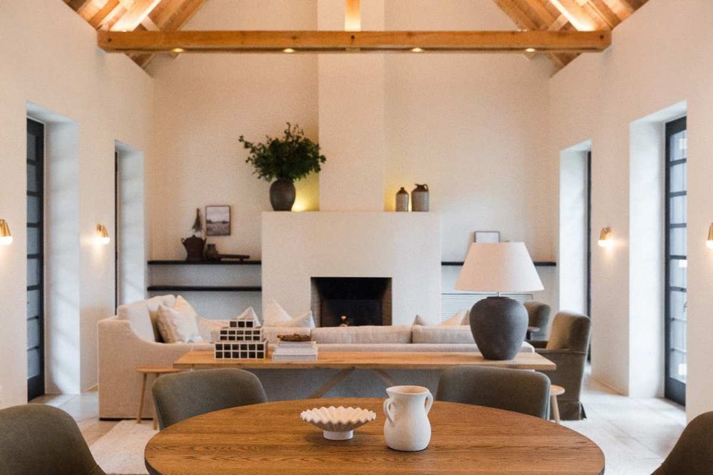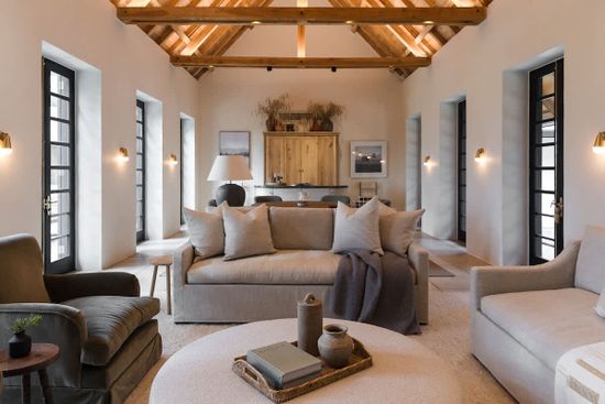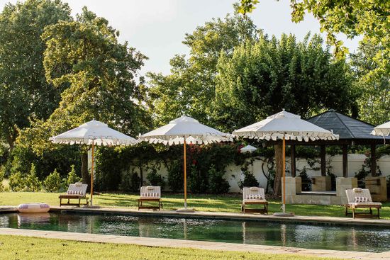 The Farmhouse is the central gathering space for guests at Franschhoek Wonder. Two living spaces, a large kitchen, a dining room, and a library are set around a central courtyard, inviting guests to reconnect with loved ones. From the Farmhouse, two sweeping patios provide access to the sparkling pool. Four beautiful bedrooms are also situated within the Farmhouse.