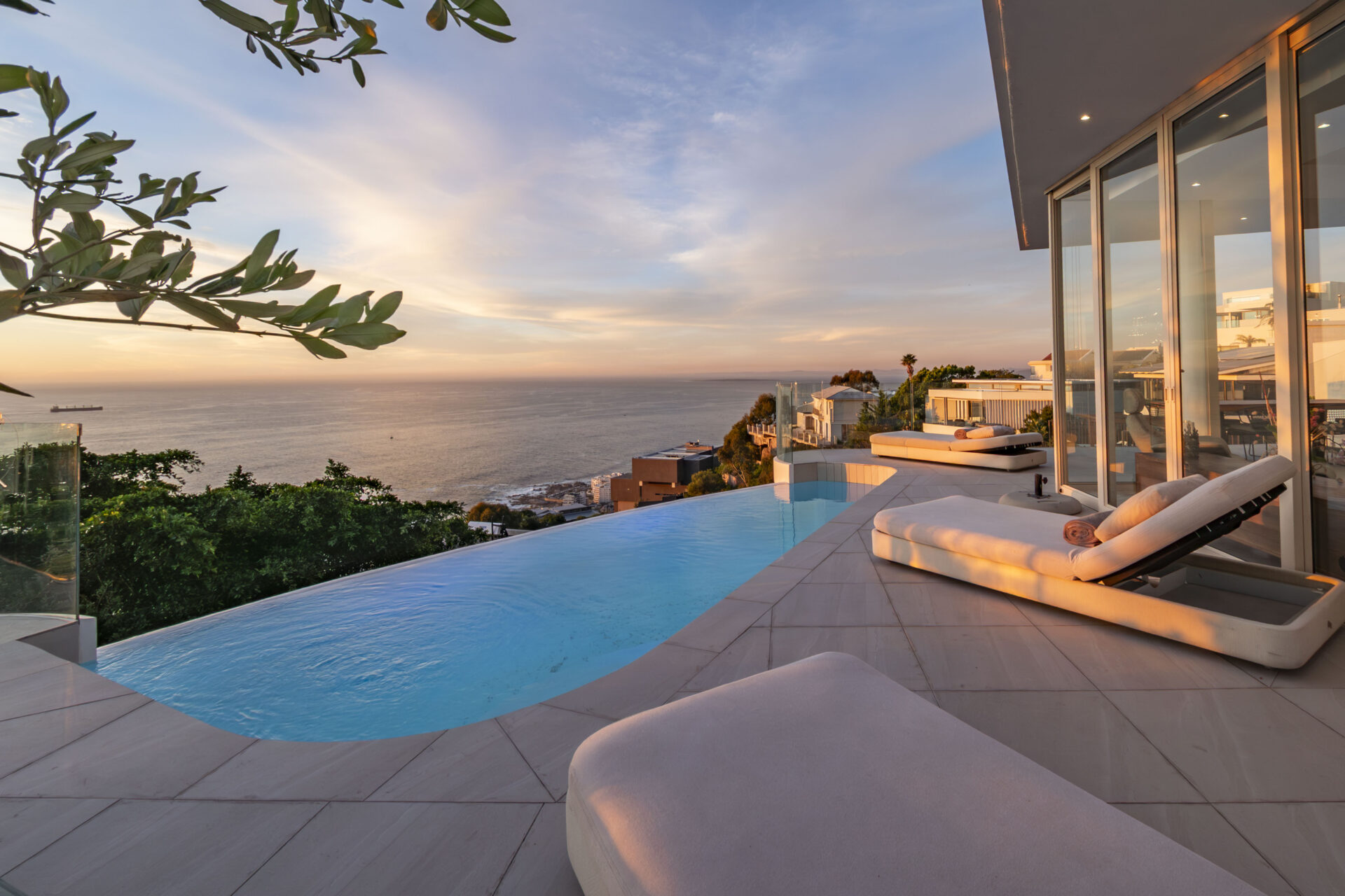 The living room level includes a lounge, multiple dining areas, bar, kitchen, terrace and a stunning infinity pool with loungers for tanning and enjoying the Cape Town summer days.