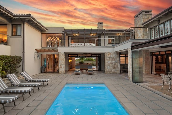 Perched on a cliff along the famous Hermanus Cliff Path, this luxurious home offers breathtaking views of the Atlantic Ocean and the surrounding fynbos-draped hills. The Hemingway House comfortably accommodates up to 15 guests in five king en-suite rooms and one bunk room. Including a private pool, jacuzzi (hot tub), three kitchens, two bars, and several indoor and outdoor dining areas, it is the perfect place for large groups. It is professionally styled with luxury amenities.