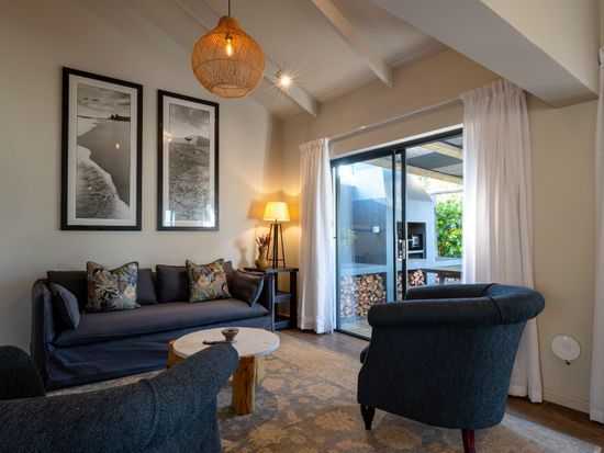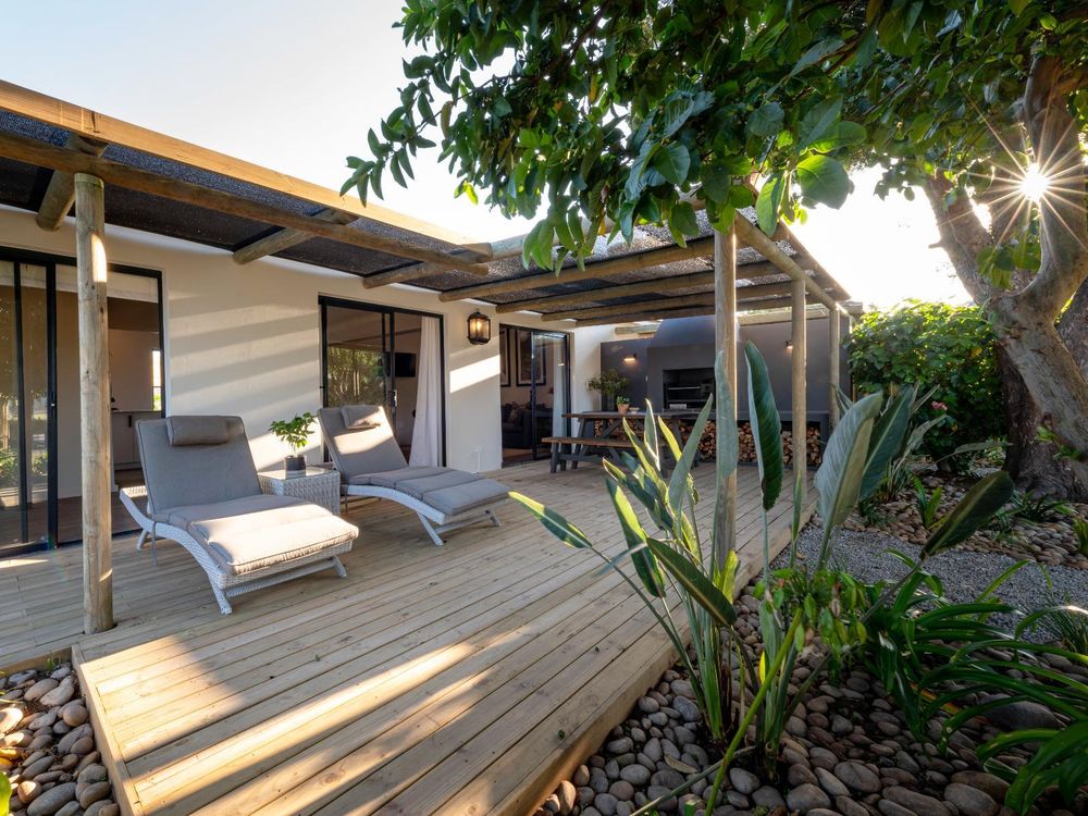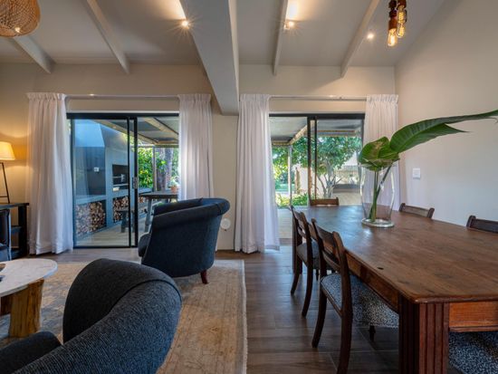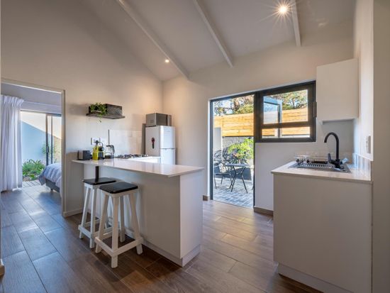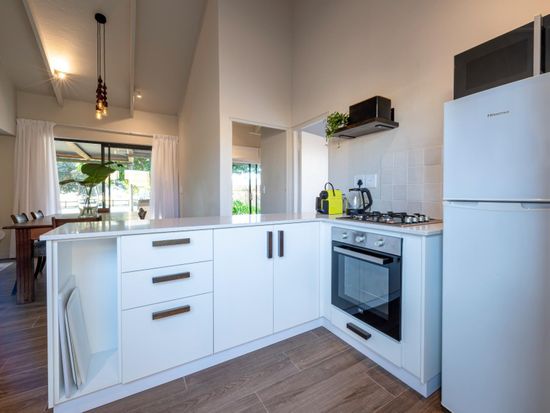 This modern, newly renovated cottage is situated at Rhone Hill Polo Club. The cottage is tastefully furnished with open plan living areas which lead out to a covered patio and deck. This is a lovely tranquil space to enjoy a barbeque and relax on a lounger after a day of activities. There are two bedrooms, one with a bunk bed, and both have sliding doors leading out to the deck area. Rhone Hill Polo Club is a short drive out of town, on the edge of the Bitou Nature Reserve.
