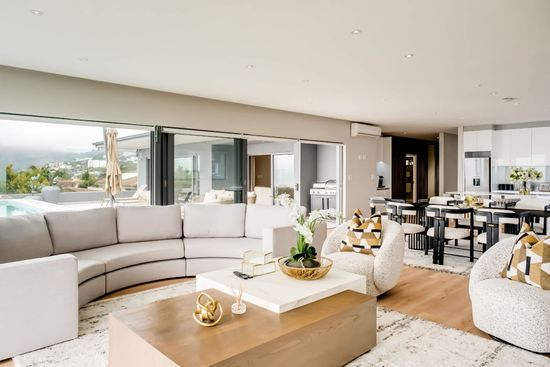 The open-plan kitchen features a gas hob, bean coffee machine, and breakfast bar for three. The living and dining areas, complete with aircon and seating for nine, lead to the outdoor balcony. Here, you'll find a pool, sun loungers, and a gas BBQ, all set against the backdrop of Camps Bay's breathtaking scenery.