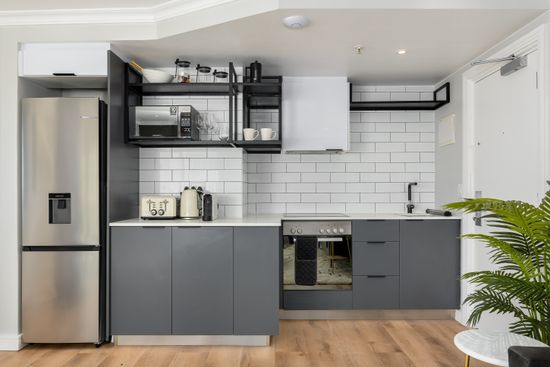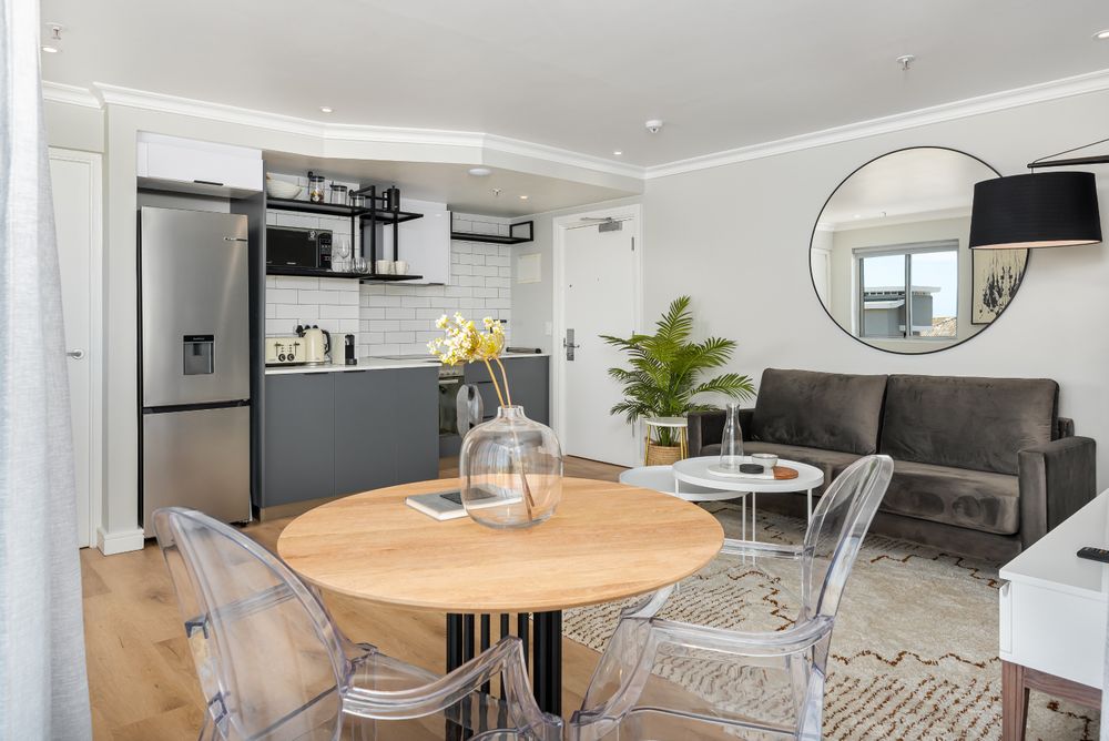 This modern studio apartment features high-end furnishings and finishes throughout. The kitchen is fully equipped with everything you need to cook up a storm. The bedroom has a comfortable queen size bed with aircon and ample cupboard space. The bathroom has a walk-in shower. The lounge has a Smart TV and opens onto a spacious balcony with outdoor furniture and views of Table Mountain, the city and the harbour.