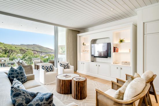 The open-plan living and dining area, complete with air conditioning and seating for seven, flows seamlessly onto a balcony with panoramic views. This is perfectly complemented by a modern kitchen featuring a gas hob, dishwasher, a breakfast bar for four, and a separate laundry room. Outdoor spaces invite al fresco dining and relaxation, while residents enjoy a communal pool, a fully equipped gym, and secure garage parking. Ideally located, Table Mountain Cable way is just a 6-minute drive, and the V&A Waterfront is around 15 minutes away, offering a serene yet central Cape Town retreat.