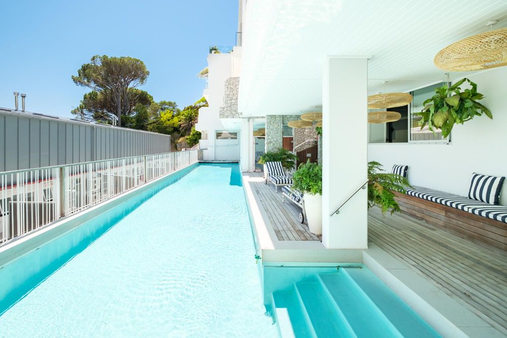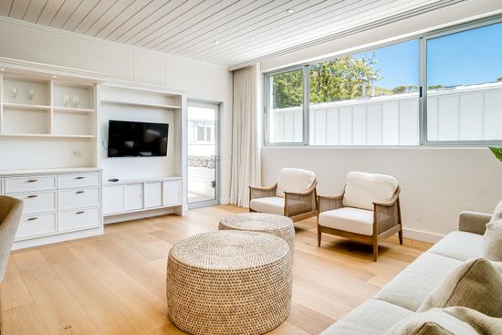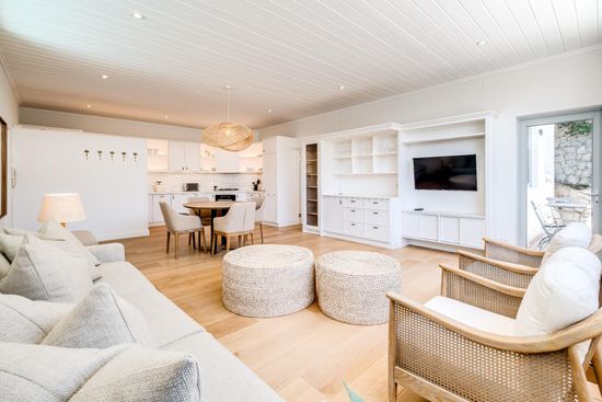 The open-plan living and dining area accommodates five and four guests respectively, with access to a small deck. Outdoors, a private deck offers dining for two and an outdoor shower. Guests enjoy access to a communal pool and gym, along with a dedicated parking bay. Located just a short drive from Camps Bay Beach and Cape Town City Centre, the location blends convenience with serenity.