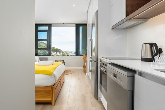 This modern studio apartment features clever compact design with all the essentials: a fully equipped kitchen, a comfortable queen-size bed, TV with Netflix, a bathroom with walk-in shower, and stunning ocean and mountain views.