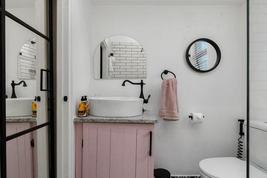 - Modern Bathroom: There is a bathroom with a walk-in shower.