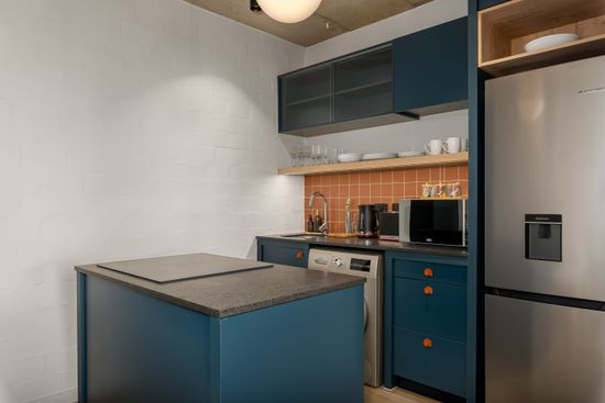 The fully equipped kitchen features all the essentials, including a stove, fridge, microwave, kettle, toaster, and a central island that doubles as a dining or workspace.