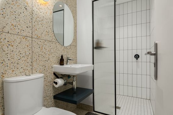 The modern bathroom features a spacious walk-in shower and clean, minimalist design — a refreshing start or end to your day.