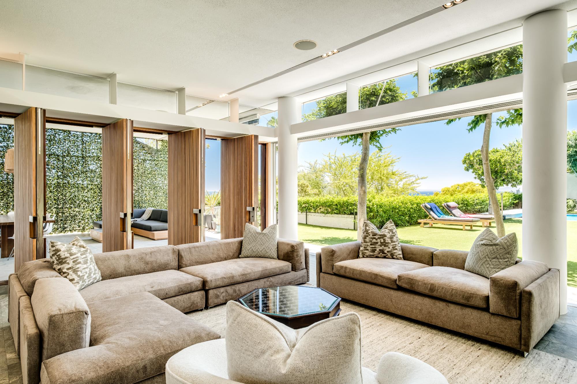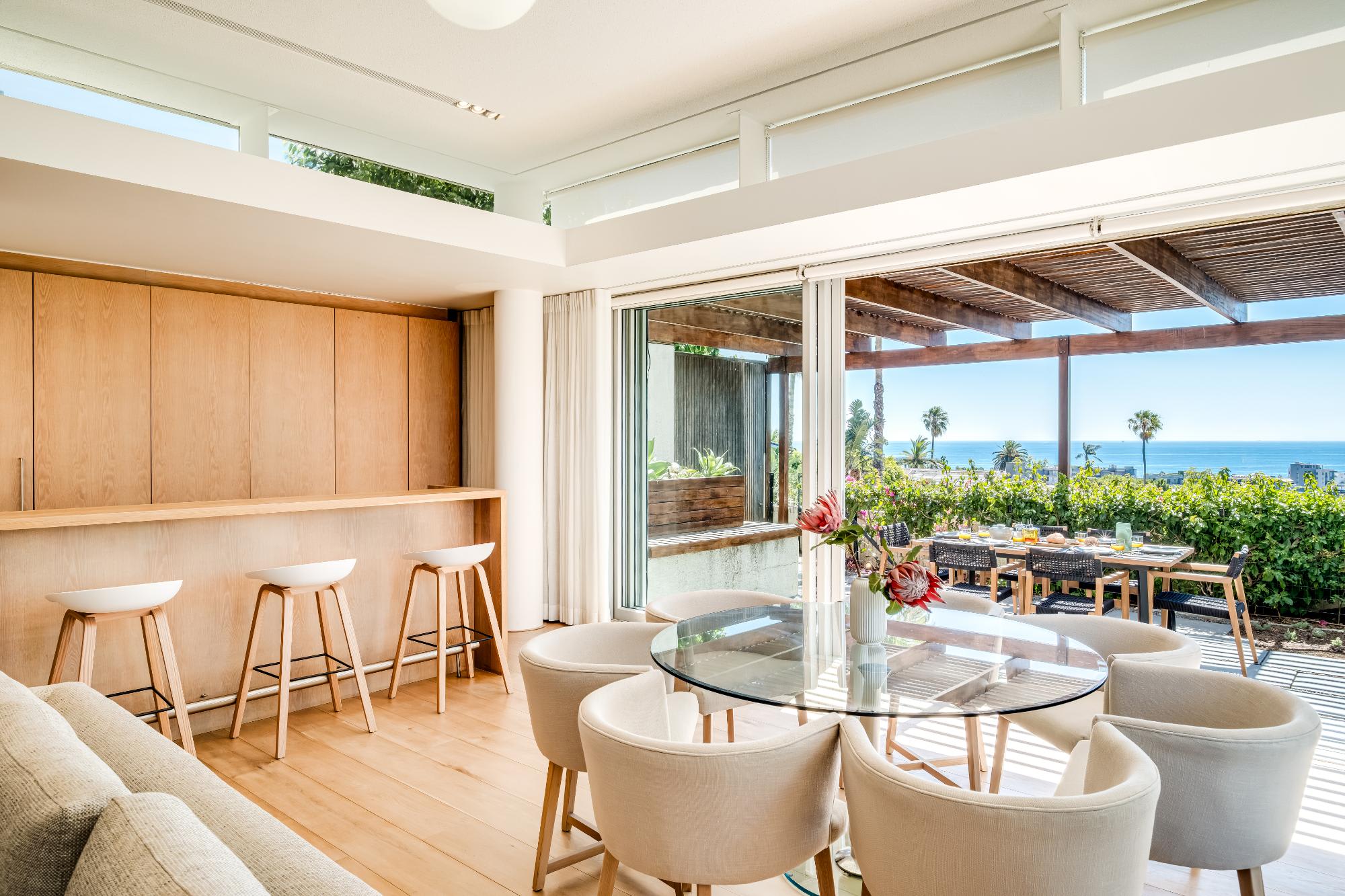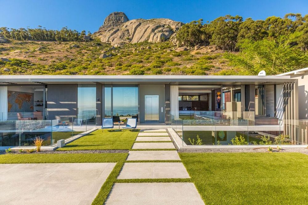 With its back to the mountain, this deeply private home reveals itself with flourish — the moments both unexpected and brilliant — culminating in unrivaled views of the Atlantic Ocean and Robben Island. Inside, a gravity-defying timber staircase transports guests into double-volume living spaces, where deft art and architecture plays are certain to make a lasting impression.
