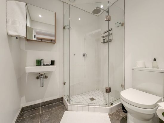 Private and secure apartment offers cosmopolitan Cape Town living at its best.The beautiful bedroom has a Queen bed. A modern kitchen greets you on the way into the dining area and lounge. The lounge and dining areas are bright and airy, with natural light flooding in from the sliding doors that open onto the terrace. A dining table for four is great for entertaining and a comfortable lounge with a couch and television calls for absolute relaxation. Sliding doors open onto a private balcony.