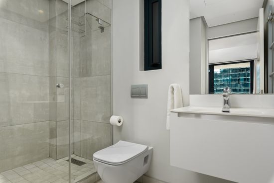 This elegant studio has a fully equipped modern design kitchen, as well as a lounge section with 2x occasional chairs and a footstool in front of the bed. The bedroom section includes a queen-size bed with an en suite walk-in shower. The window with sliding doors on the 20th floor is ideal for taking in the city's views with a peak of the hills in the backdrop.