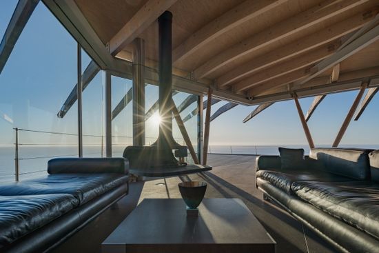 This spectacular home really is an entertainer’s dream. The top floor comprises the lounge/living room, kitchen, and rim-flow pool. The sauna/ steam room and library are situated one level down, below the living area.