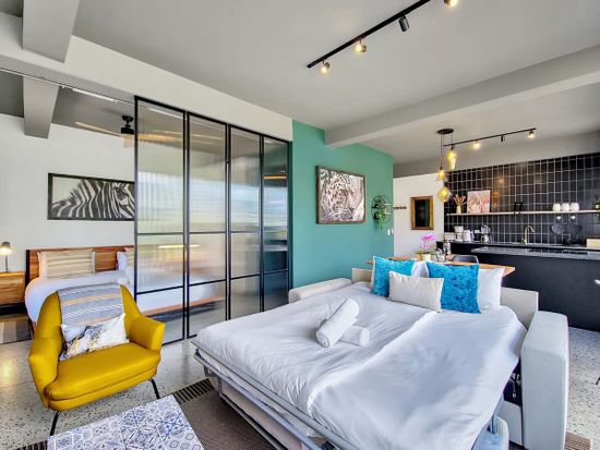 Unique space with two stand alone apartments next door to each other - each consisting of one bedroom and a sleeper sofa in the living room which can accommodate two more people. Each apartment has its own kitchen, living, dining and bathroom. This is a secure building which isn't affected by Loadshedding. There are also Communal Areas such as a Rooftop pool and outdoor rooftop seating area