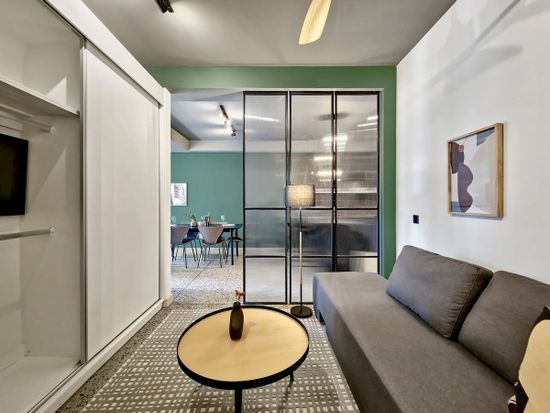 This unique apartment is one of the few units with this creative layout- have the dining and kitchen area together leading out to a private balcony, and a separate living room area with a sleeper sofa (perfect for 1 adult or 2 kids) and one separate bedroom. Everything has been tastefully picked out and thoughtfully decorated. Great communal areas and 24hr security for peace of mind