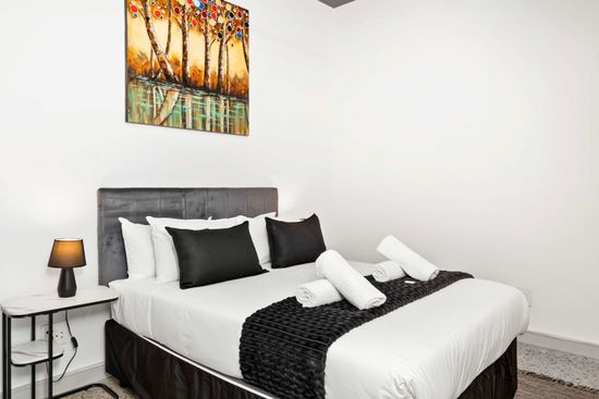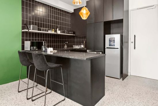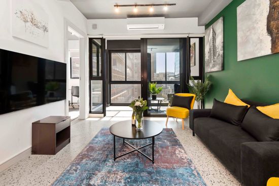 The Duke 2-Bedroom Gem features a thoughtfully designed interior that blends style and functionality. The open-plan living area is bright and airy, showcasing elegant decor with a modern touch. The kitchen is equipped with sleek black cupboards and backsplash tiles, making it both stylish and practical for preparing meals. The bedroom offers a comfortable workspace, perfect for those needing to catch up on tasks. With an enclosed balcony that allows for additional relaxation space, you can enjoy the fresh air while taking in the neighborhood's vibrant energy. The communal rooftop pool provides a stunning backdrop for unwinding under the Cape Town sun, making this apartment a perfect retreat for both leisure and productivity.
