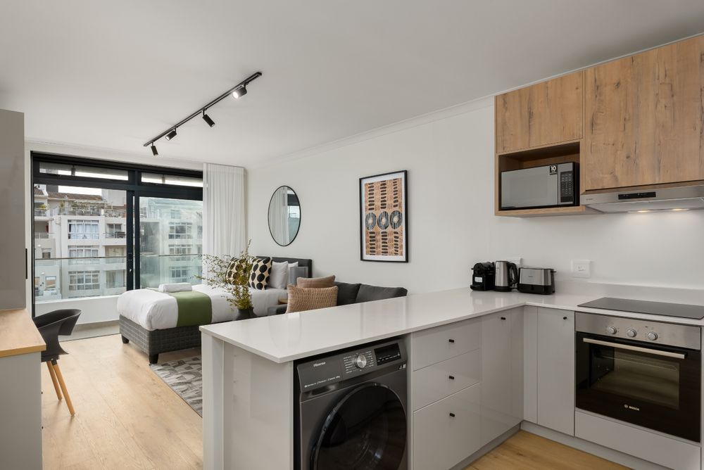 Escape to this light and bright studio apartment in The Sage, a new development in the heart of Sea Point. The apartment is nestled just a stone's throw away from the popular Sea Point Promenade, close to popular restaurants, cafes, and shops. The V&A Waterfront is just a 10-15 minute drive away, and a scenic 10-15 minute drive takes you to Table Mountain. Alternatively, take a stroll or drive down to the world-famous Clifton and Camps Bay beaches.
