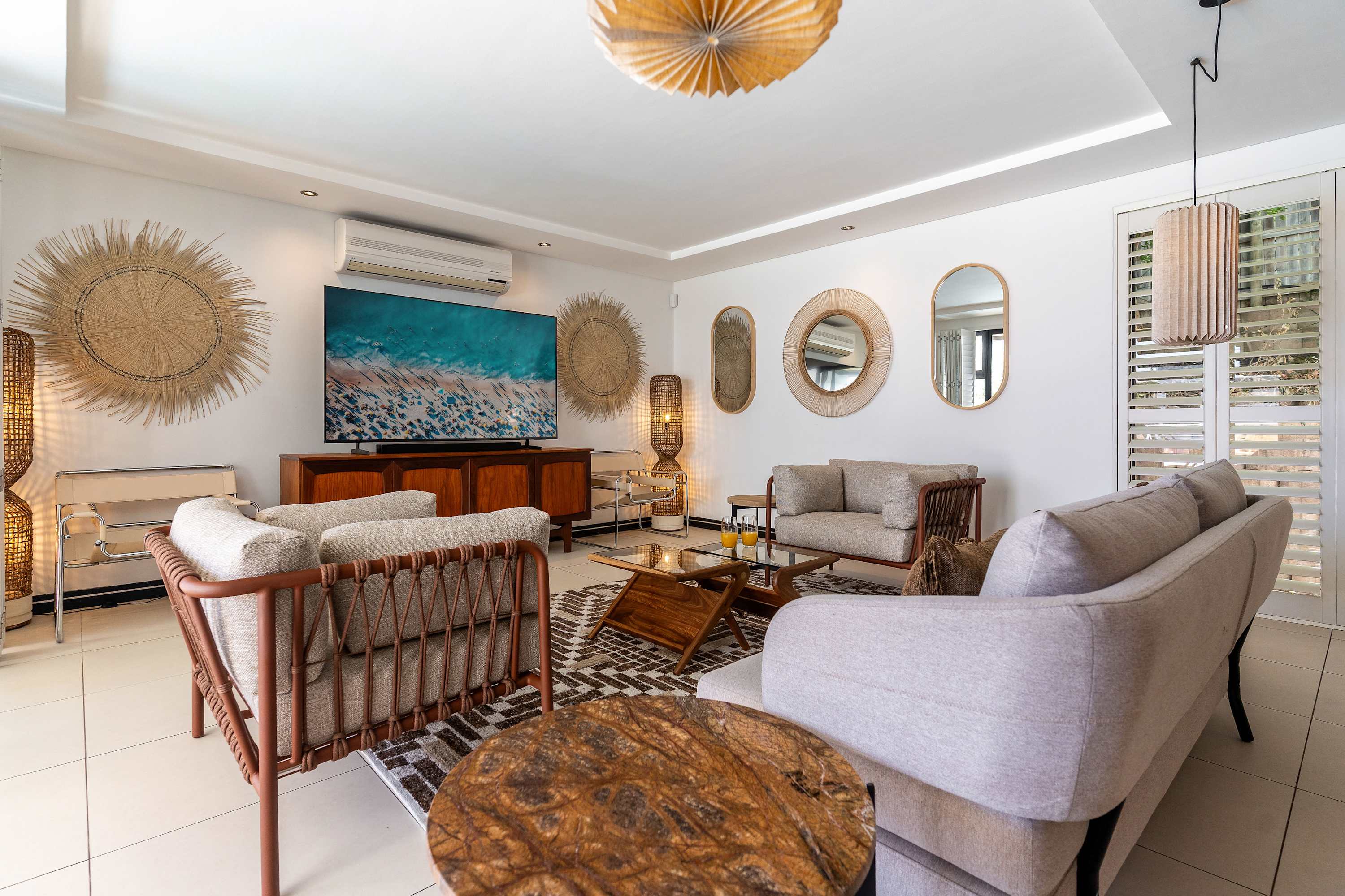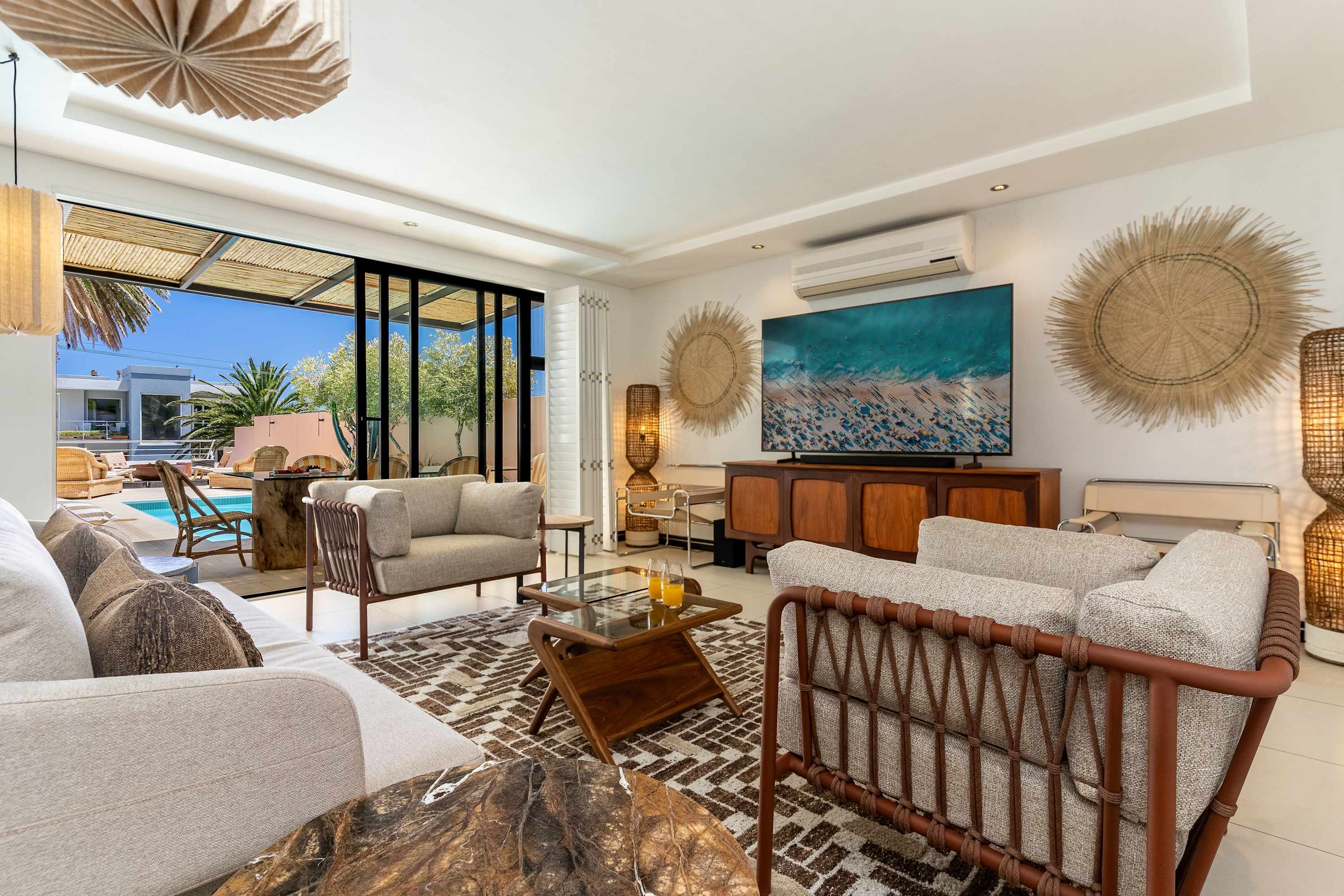 Inside, the villa’s open-plan layout creates a warm and welcoming atmosphere for families and groups. The fully equipped kitchen with a breakfast bar makes casual dining a breeze, while the elegant dining area and outdoor tables are ideal for shared meals. Two lounges with comfy seating and TVs provide plenty of space for everyone to unwind, whether you’re watching a movie or simply soaking in the views.