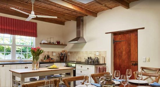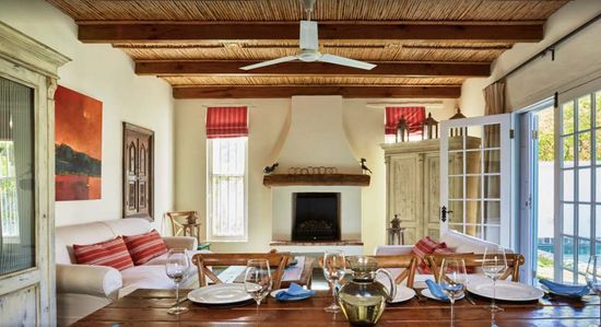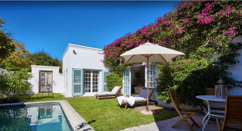 Located on one of Franschhoek’s oldest roads, this beautiful cottage’s unimposing wooden entrance and tin-roof veranda belie the elegance and spaciousness found inside. Wrapped around a secluded, bougainvillea-clad courtyard garden with swimming pool and sun-loungers, Tockie’s Cottage's charm and warmth lie in its modern farmhouse feel, large sash windows, wooden floors and ceilings and relaxed, open-plan layout. The mountain views, sun-drenched rooms and complete privacy make this an idyllic Franschhoek retreat.