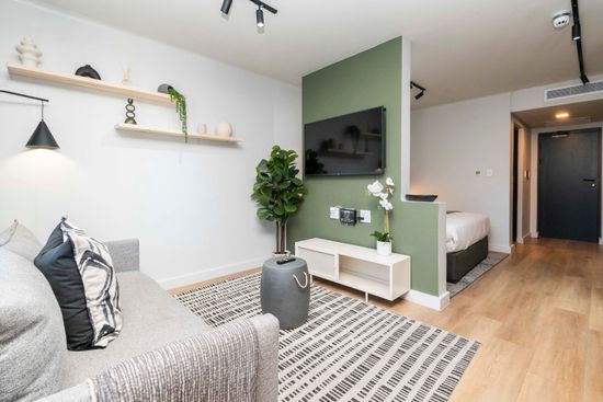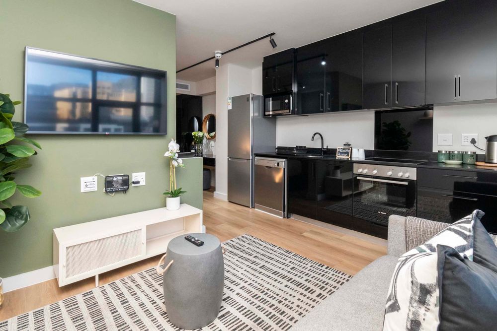 The apartment is thoughtfully designed to make the most of its compact space. Featuring sleek, contemporary decor, the studio includes a comfortable bed, a fully equipped kitchenette with high-end appliances, and a modern bathroom. The living area is cozy and well-appointed, with a smart TV and stylish furnishings. Large windows allow natural light to flood the space, creating a bright and inviting atmosphere. Guests will appreciate the attention to detail and the high-quality finishes that make this studio a perfect home away from home.