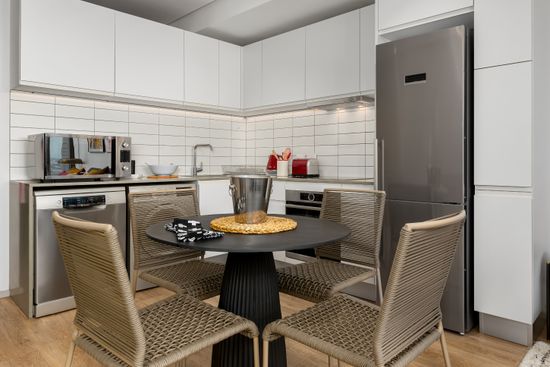 This open-plan apartment is perfect for two, offering the ideal blend of comfort and style. It features a fully equipped, modern kitchen with all the amenities you could desire—including a washing machine, dishwasher, and smart appliances. The living and dining area is designed for relaxation—with air conditioning, a smart television and unlimited high-speed Wi-Fi. Whether you're unwinding after a day of exploration or indulging in a quiet evening at home, the apartment offers all the comforts of modern living, with backup power to ensure you're unaffected by load shedding.