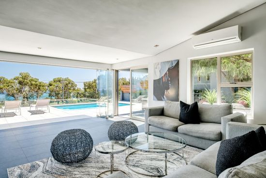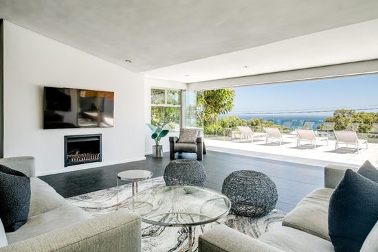 The open-plan living and dining area, with seating for five and a large dining table, opens to a pool deck with sea views. A TV room offers a relaxed space to unwind. The kitchen is fully equipped with modern amenities, including a gas hob, Nespresso machine, and dishwasher. Outdoors, the pool and sun loungers invite relaxation, while a gas BBQ is ideal for al fresco dining. About a 10-minute walk to Camps Bay Beach and a 5-minute drive to Table Mountain Cableway, Valtameri provides both peace and easy access to Cape Town's attractions.