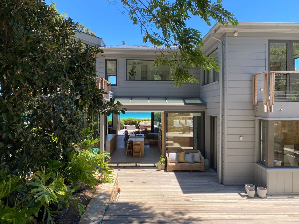 As you make your way across a little bridge, hovering above a running stream that trickles down from the forest of the Glen, and walk through the front doors into the vast, open living space, it’s apparent that no design detail has been curated without conscious consideration to this property’s perfect positioning. In keeping with the area’s strict building regulations and retaining its bungalow personality, the home has been re-birthed into this century with stark, dark shades of grey – seamlessly blending itself into the natural environment, amongst the milkwood trees. Beautiful old oak flooring and bespoke cabinetry signify the running theme, with off-shutter concrete walls and Caesarstone quartz countertops, refined furnishings, warm rugs and family collectables embellishing the easy flow of the interior with finesse. All cradled by the boundless light and ocean air that engulfs every space, through tall glass doors that slide open to a magnificent deck, with its swimming pool, sunken fire-pit and seating areas aplenty. Set on two floors, the top level holds space for the main ensuite that looks out into the forest, and an inspiring study, overlooking the beach and all the way up to the apostles. An additional two ensuite bedrooms sit on the lower level, as well as a TV-come-music-library room. It’s an idyllic family set-up that holds an earnest space for you and your favourite people to gather, unwind and relish in the brilliance of beach life.